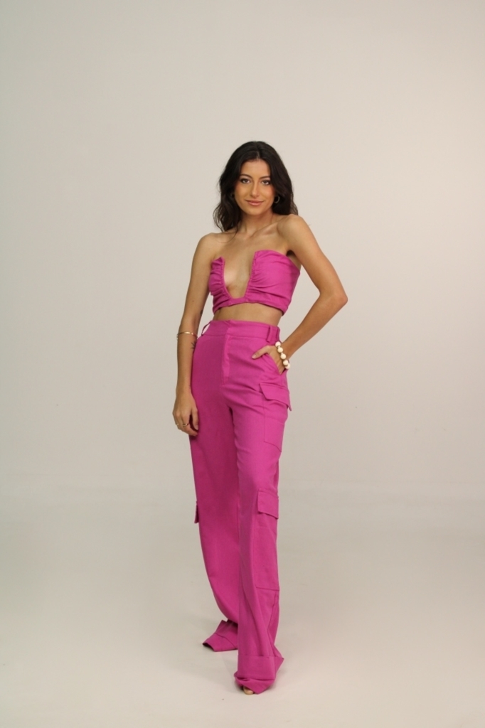 Cropped alongado confeccionado em viscolinho. Possui aro de media rigidez no decote que possibita ajustar ao formato dos seios. A peça conta com ganchos internos e duas alças avulsas com regulador.